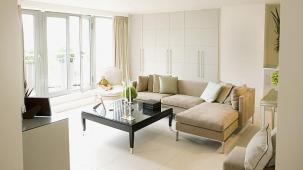 This apartment with nice shades of blue and a beautiful bathroom will help you to relax after work.